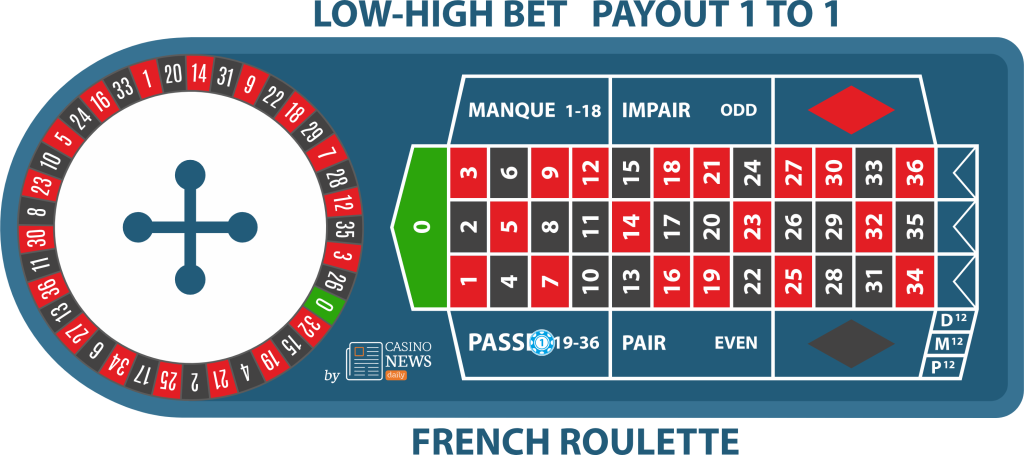 5. Satsning på lågt/högt– Det innefattar alla låga nummer eller alla höga nummer och placeras på “Lågt”-rutan (nummer 1 till 18) eller “Högt”-rutan (nummer 19 till 36). Utdelningen är 1 mot 1.