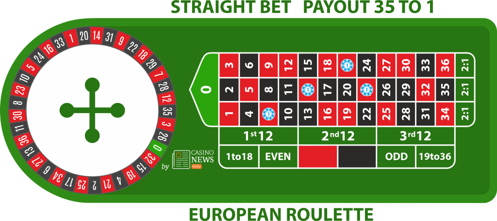 1. Straight-up bet – Det placeras på vilket singelnummer som helst, inklusive “0”, direkt på numret. Utdelningen är 35 mot 1.
