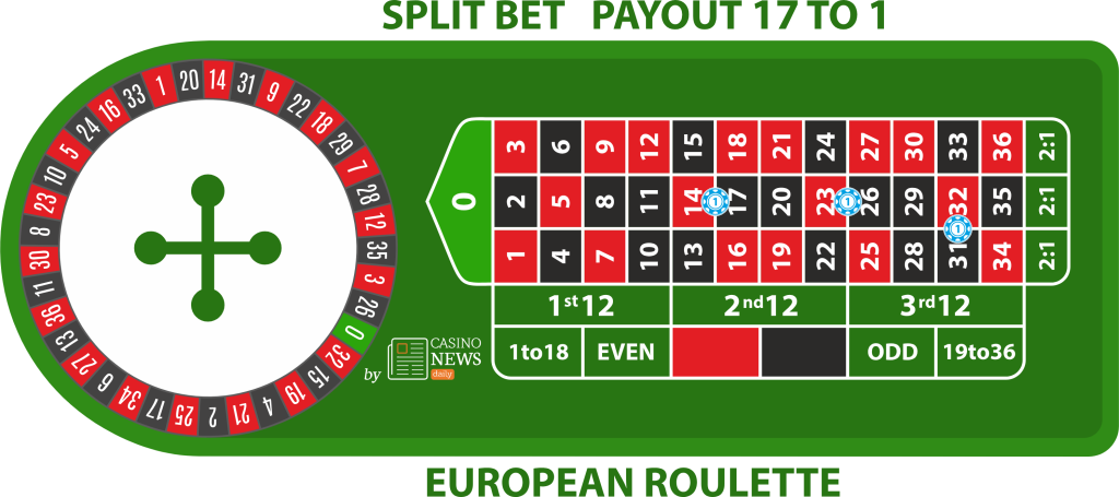 2. Split bet – Det innefattar två angränsande nummer och placeras på linjen mellan dessa nummer. Satsningen kan också inkludera 0 och 1, 0 och 2 samt 0 och 3. Utdelningen är 17 mot 1.