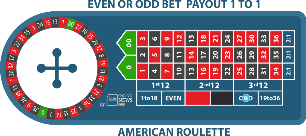 4. Satsning på udda/jämnt – Det innefattar alla jämna nummer eller alla udda nummer på spelduken och placeras på “Even”-rutan (alla jämna nummer) eller på “Odd”-rutan (alla udda nummer). Utdelningen är 1 mot 1.