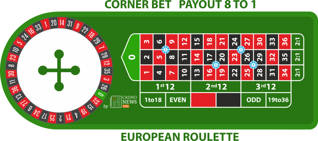 4. Corner bet – Det innefattar en grupp om fyra nummer och placeras i hörnet där dessa fyra nummer möts. Satsningen kan också placeras på hörnet av 0, 1, 2 och 3. Utdelningen är 8 mot 1.