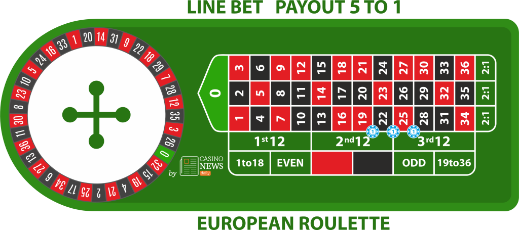 5. Line bet – Det innefattar sex nummer (eller två rader med tre nummer) och placeras i änden av två rader, på gränsen mellan dem. Utdelningen är 5 mot 1.