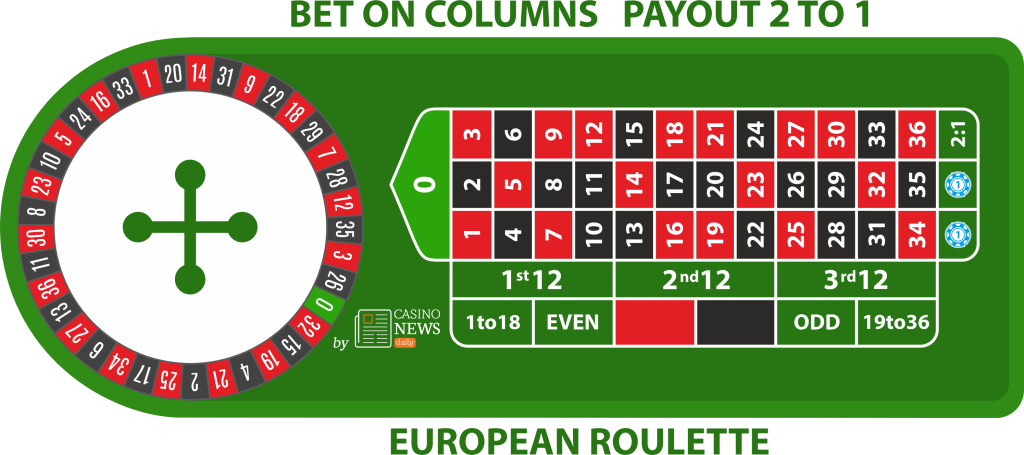 1. Kolumnsatsning/Column bet – Det innefattar en hel kolumn och placeras på “2-1”-rutan i änden av en kolumn. Utdelningen är 2 mot 1.