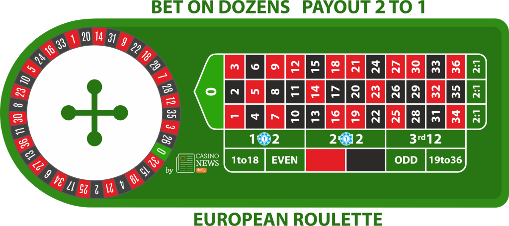 2. Dussinsatsning/Dozen bet – Det innefattar en grupp av 12 nummer och kan placeras på “1st 12”-rutan (1 till 12), “2nd 12”-rutan (13 till 24) eller på “3rd 12”-rutan (25 till 36). Utdelningen är 2 mot 1.